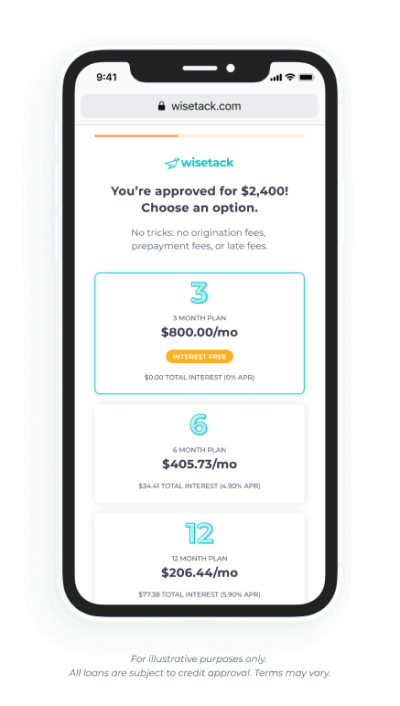 *All financing is subject to credit approval. Your terms may vary. Payment options through Wisetack are provided by our lending partners. For example, a $1,200 purchase could cost $104.89 a month for 12 months, based on an 8.9% APR, or $400 a month for 3 months, based on a 0% APR. Offers range from 0-35.9% APR based on creditworthiness. State interest rate caps may apply. No other financing charges or participation fees. See additional terms at https://wisetack.com/faqs. https://www.wisetack.com/faqs..